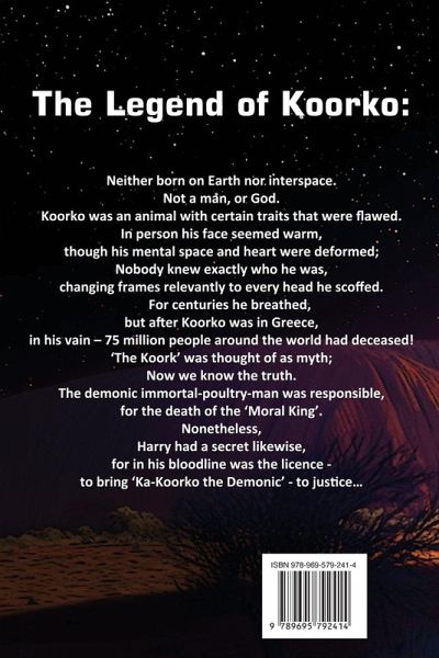 Neither born on Earth nor interspace, not a man or God.Koorko was an animal with certain traits that were flawed. In person his face seemed warm, though his mental space and heart were deformed; Nobody knew exactly who he was, changing frames relevantly to every head he scoffed.For centuries he breathed, but after Koorko was in Greece, in his vain - 75 million people around the world had deceased! The Koork was thought of as myth; Now we know the truth. The demonic immortal-poultry-man was responsible, for the death of the 'Moral King'.Nonetheless, Harry had a secret likewise, for in his bloodline was the licence to bring 'Ka-Koorko the Demonic' to justice...