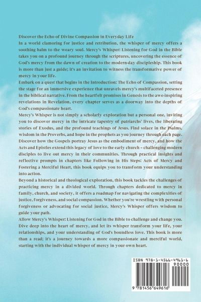 Discover the Echo of Divine Compassion in Everyday Life In a world clamoring for justice and retribution, the whisper of mercy offers a soothing balm to the weary soul. Mercy's Whisper: Listening for God in the Bible takes you on a profound journey through the scriptures, uncovering the essence of God's mercy from the dawn of creation to the modern-day discipleship. This book is more than just a guide; it's an invitation to witness the transformative power of mercy in your life. Embark on a quest that begins in the Introduction: The Echo of Compassion, setting the stage for an immersive experience that unravels mercy's multifaceted presence in the biblical narrative. From the heartfelt promises in Genesis to the awe-inspiring revelations in Revelation, every chapter serves as a doorway into the depths of God's compassionate heart. Mercy's Whisper is not simply a scholarly exploration but a personal one, inviting you to discover mercy in the intricate tapestry of patriarchs' lives, the liberating stories of Exodus, and the profound teachings of Jesus. Find solace in the Psalms, wisdom in the Proverbs, and hope in the prophets as you journey through each page. Discover how the Gospels portray Jesus as the embodiment of mercy, and how the Acts and Epistles extend this legacy of love to the early church - challenging modern disciples to live out mercy in their communities. Through practical insights and reflective prompts in chapters like Following in His Steps: Acts of Mercy and Fostering a Merciful Heart, this book equips you to transform your understanding into action. Beyond a historical and theological exploration, this book tackles the challenges of practicing mercy in a divided world. Through chapters dedicated to mercy in family, church, and society, it offers a roadmap for navigating the complexities of justice, forgiveness, and social compassion. Whether you're wrestling with personal forgiveness or advocating for social justice, Mercy's Whisper offers wisdom to guide your path. Allow Mercy's Whisper: Listening for God in the Bible to challenge and change you. Dive deep into the heart of mercy, and let its whisper transform your life, your relationships, and your understanding of God's boundless love. This book is more than a read; it's a journey towards a more compassionate and merciful world, starting with the individual whisper of mercy in your own heart.