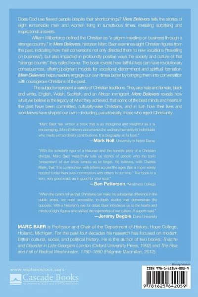 Does God use flawed people despite their shortcomings? Mere Believers tells the stories of eight remarkable men and women living in tumultuous times, revealing surprising and inspirational answers. William Wilberforce defined Christian as ""a pilgrim travelling on business through a strange country."" In Mere Believers, historian Marc Baer examines eight Christian figures from the past, indicating how their conversion not only directed them to new vocations (""travelling on business""), but also impacted in profoundly positive ways the society and culture of that ""strange country"" they called home. The book reveals how faithful lives can have revolutionary consequences, offering poignant models for vocational discernment and spiritual formation. Mere Believers helps readers engage our own times better by bringing them into conversation with courageous Christians of the past. The subjects represent a variety of Christian traditions. They are male and female, black and white, English, Welsh, Scottish, and an African immigrant. Mere Believers reveals how what we believe is the legacy of what they achieved, that some of the best minds and hearts in the past have been committed, culturally wise Christians, and in turn how their lives and worldviews have shaped our own--including, paradoxically, those who reject Christianity.