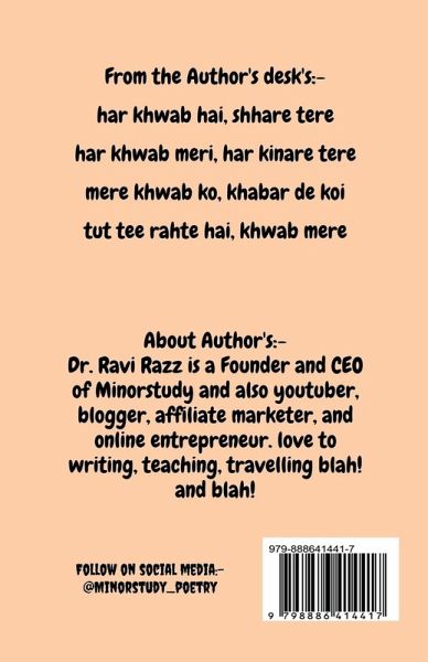 "Mere Khwab - Tum Sang Ke Khwab" ek aisi shayari sangrah hai jo mohabbat ke har ehsaas ko shabdon mein piroti hai-ek aisi kahani jo dil se shuru hoti hai aur rooh tak jaati hai। Is kitaab mein pyaar ki gehraai, judaai ka dard, intezaar ki bechaini, aur yaadon ki mithaas ko madhur aur jazbaati alfazon mein sajaya gaya hai। Har kavita ek kahani hai-kabhi milne ki, kabhi bichhadne ki, kabhi sirf yaadon mein jeene ki। Yeh shayari sirf padhne ke liye nahi, mehsoos karne ke liye hai। Har pankti ek aaina hai jo kisi na kisi mod par aapki apni kahani dikhayegi। Agar aapne kabhi pyaar kiya hai, kisi ki yaadon mein khud ko kho diya hai, ya kisi adhuri kahani ka hissa rahe hain, toh yeh kitaab aapke dil ke kareeb zaroor aayegi। "Mere Khwab - Tum Ke Sang Khwab" sirf ek kitaab nahi, ek safar hai-jo shayari ke jazbaati samundar mein aapko doobne ka mauka dega। Tayaar ho is safar ke liye? Kyunki mohabbat sirf lafzon tak simit nahi, balki har shabd ek mehsoos ban jaata hai। Dr. Ravi Razz @Minorstudy_poetry