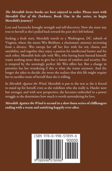 The Meredith Series books are best enjoyed in order. Please start with Meredith Out of the Darkness, Book One in the series, to begin Meredith's journey! Loss and heartache brought strength and self-discovery. Now she must stay true to herself as she's pulled back toward the past she's left behind. Seeking a fresh start, Meredith travels to a Washington, DC suburb of Virginia, where she meets Wes Bickhart, a charismatic attorney recovering from a divorce. Wes sweeps her off her feet with his wit, charm, and amiability, and together they enjoy a passion for intellectual banter and for each other. Meredith feels safe with Wes, who having been burned himself, wants nothing more than to give her a future of comfort and security. She is tempted by the seemingly perfect life Wes offers her. But a change in priorities has her wondering if this is what she wants anymore. And the longer she takes to decide, the more she realizes that this life might require her to sacrifice more of herself than she is willing. In Meredith Against the Wind, Meredith is put to the test as she is forced to stand up for herself, even as she redefines who she really is. Harder now but stronger, and with new perspective, she becomes embroiled in a power struggle as she determines how much is worth surrendering for love. Meredith Against the Wind is second in a slow-burn series of cliffhangers ending with a warm and satisfying happily-ever-after.