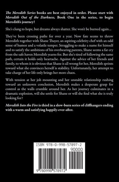The Meredith Series books are best enjoyed in order. Please start with Meredith Out of the Darkness, Book One in the series, to begin Meredith's journey! She's clung to hope, but dreams always shatter. She won't be burned again... They've been crossing paths for over a year. Now fate seems to throw Meredith together with Shane Thayer, an aspiring celebrity chef with an odd sense of humor and a volatile temper. Struggling to make a name for himself and to satisfy the ambitions of his overbearing parents, Shane seems a far cry from the safe haven Meredith yearns for. But she's tired of following the same path, certain it holds only heartache. Against the advice of her friends and family, to whom it is obvious that Shane is all wrong for her, Meredith sprints toward what she convinces herself is stability. Unfortunately, her attempt to take charge of her life only brings her more chaos. With tension at her job mounting and her unstable relationship rushing toward an unknown conclusion, Meredith makes a desperate grasp for control as the walls crumble around her. As her journey culminates in a dramatic explosion, will she settle for Shane or will she find what she is truly looking for? Meredith Into the Fire is third in a slow-burn series of cliffhangers ending with a warm and satisfying happily-ever-after.