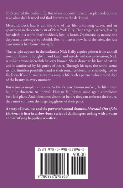 She's created the perfect life. But when it doesn't turn out as planned, can she take what she's learned and find her way in the darkness? Meredith Beck had it all: the love of her life, a thriving career, and an apartment in the excitement of New York City. Then tragedy strikes, leaving her adrift in a world that's suddenly lost its luster. Optimistic by nature, she desperately attempts to rebuild. But no matter how hard she tries, she just can't muster her former strength. Then a light appears in the darkness: Nick Kelly, a quiet painter from a small town in Maine. Thoughtful and kind, and utterly without pretension, Nick is unlike anyone Meredith has ever known. She is drawn to his love of nature and is comforted by his purity of heart. Through his eyes, the world seems to hold limitless possibility, and as their romance blossoms, she's delighted to find herself on the road toward a simpler life, with a partner who reminds her of the beauty in every moment. But it isn't as simple as it seems. As Nick's own demons surface, the life they're building threatens to unravel. Human fallibilities once again complicate best-laid plans. And it becomes clear that before they can embrace the future, they must confront the lingering ghosts of their pasts. A story of love, loss and the power of second chances, Meredith Out of the Darkness is first in a slow-burn series of cliffhangers ending with a warm and satisfying happily-ever-after.