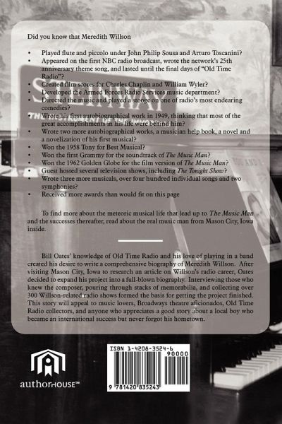 Meredith Willson - America's Music Man is a loving, thorough and accurate examination of one of Broadway's great composers. It tells the story before, during and after The Music Man opened in 1957. The story of Willson's family, his life in Mason City, Iowa, and his eventual rise to the top of the music world forms the platform that led to four musicals and dozens of awards. Also included are Willson's activities scoring movies, directing orchestras on Old Time Radio, and even becoming a character on radio and television shows. This is the first in-depth look at the career of a real music man from north central Iowa.
