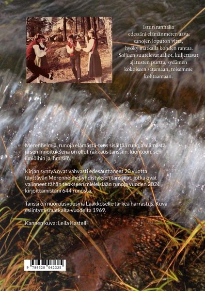 Merenhelmiä, runoja elämästä-teos sisältää runoja elämästä ja sen innoituksena on ollut rakkaus tanssiin, luontoon, sen ilmiöihin ja ihmisiin. Kirjan syntyä ovat vahvasti edesauttaneet 20 vuotta täyttävän Merenhelmet yhdistyksen tanssijat, jotka ovat valinneet tähän teokseen mieleisiään runoja vuoden 2021 kirjoittamistani 644 runosta. Tanssi oli nuoruudessa Laakkosen sydäntä lähellä oleva harrastus, kuva vuodelta 1969 Hyvinkään kansalaisopiston tanhuryhmän esiintymismatkalta. Kannen kuva: Leila Kastelli