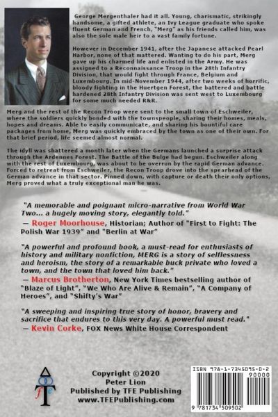 George Mergenthaler, the grandson of the inventor of the Linotype, was an only child and at the time of his birth in 1920, became the sole male heir to the family fortune. Tall, handsome, Ivy League educated, speaking fluent German and French, "MERG" as he was known to his friends, did what many in his generation did following the surprise attack on Pearl Harbor: he enlisted in the Army. Insisting on serving as a buck-private, George was assigned to a Recon Troop that would see action after the D-Day invasion in France, Belgium and Luxembourg. Following the horrific fighting in the Huertgen forest, the 28th Cavalry Recon Troop was sent west for R&R, to a small farming village in Luxembourg called Eschweiler. For the next month the Recon Troop soldiers lived amongst the townspeople, sharing their homes, meals, hopes and dreams. A devout Catholic, George spent much of his free time in the town's small church, St. Mauritius, chatting and getting to know the local priest. Quickly, the two bonded, sharing a friendship not unlike that of long-lost brothers. In mid-December however, their peaceful stay in Eschweiler was shattered by the Battle of the Bulge. Nearly surrounded by the enemy, the Recon Troop soldiers were forced to retreat from the town. Dodging enemy fire, their convoy drove down a winding road, towards the cover of nearby woods. Rounding a corner they were ambushed by the spearhead of the German advance in that sector. Pinned down, with capture or death seeming their only options, George jumped into the command jeep and manned a .50-cal machine gun, proving how exceptional he truly was.