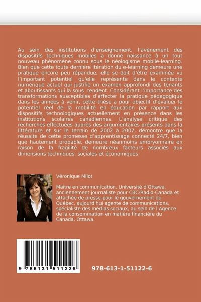 Au sein des institutions d enseignement, l avènement des dispositifs techniques mobiles a donné naissance à un tout nouveau phénomène connu sous le néologisme mobile-learning. Bien que cette toute dernière itération du e-learning demeure une pratique encore peu répandue, elle se doit d être examinée vu l important potentiel qu elle représente dans le contexte numérique actuel qui justifie un examen approfondi des tenants et aboutissants qui la sous- tendent. Considérant l importance des transformations susceptibles d affecter la pratique pédagogique dans les années à venir, cette thèse a pour objectif d évaluer le potentiel réel de la mobilité en éducation par rapport aux dispositifs technologiques actuellement en présence dans les institutions scolaires canadiennes. L analyse critique des recherches effectuées auprès des argumentaires présents dans la littérature et sur le terrain de 2002 à 2007, démontre que la réussite de cette promesse d apprentissage connecté 24/7, bien que hautement probable, demeure néanmoins embryonnaire en raison de la fragilité de nombreux facteurs associés aux dimensions techniques, sociales et économiques.