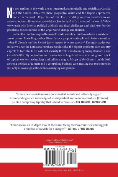 No two nations in the world are as integrated, economically and socially, as are the United States and Canada. We share geography, values and the largest unprotected border in the world. Regardless of this close friendship, our two countries are on a slow-motion collision course-with each other and with the rest of the world. While we wrestle with internal political gridlock and fiscal challenges and clash over border problems, the economies of the larger world change and flourish. Emerging economies sailed through the meltdown of 2008. The International Monetary Fund forecasts that by 2018, China's economy will be bigger than that of the United States; when combined with India, Japan and the four Asian Tigers-South Korea, Taiwan, Singapore and Hong Kong-China's economy will be bigger than that of the G8 (minus Japan). Rather than continuing on this road to mutual decline, our two nations should chart a new course. Bestselling author Diane Francis proposes a simple and obvious solution: What if the United States and Canada merged into one country? The most audacious initiative since the Louisiana Purchase would solve the biggest problems each country expects to face: the U.S.'s national security threats and declining living standards; and Canada's difficulty controlling and developing its huge land mass stemming from a lack of capital, workers, technology and military might. Merger of the Century builds both a strong political argument and a compelling business case, treating our two countries not only as sovereign entities but as merging companies. We stand on the cusp of a new world order. Together, by marshalling resources and combining efforts, Canada and America have a greater chance of succeeding. As separate nations, the future is in much greater doubt indeed.