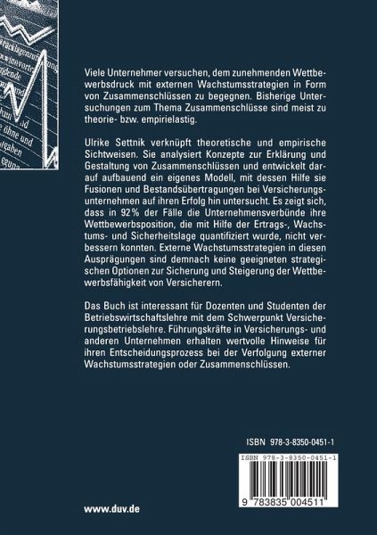 Ulrike Settnik verknüpft theoretische und empirische Sichtweisen. Sie analysiert Konzepte zur Erklärung und Gestaltung von Zusammenschlüssen und entwickelt darauf aufbauend ein eigenes Modell, mit dessen Hilfe sie Fusionen und Bestandsübertragungen bei Versicherungsunternehmen auf ihren Erfolg hin untersucht. Es zeigt sich, dass in 92% der Fälle die Unternehmensverbünde ihre Wettbewerbsposition, die mit Hilfe der Ertrags-, Wachstums- und Sicherheitslage quantifiziert wurde, nicht verbessern konnten. Externe Wachstumsstrategien in diesen Ausprägungen sind demnach keine geeigneten strategischen Optionen zur Sicherung und Steigerung der Wettbewerbsfähigkeit von Versicherern.