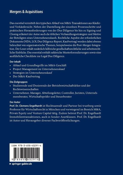 Das essential vermittelt den typischen Ablauf von M&A-Transaktionen aus Käufer- und Verkäufersicht. Neben der Darstellung der einzelnen Prozessschritte und praktischen Herausforderungen von der Due Diligence bis hin zu Signing und Closing erläutert der Autor auch die üblichen Verhandlungsstrategien und Motive der Beteiligten eines Unternehmenskaufs. Rechtliche Aspekte der erforderlichen Dokumente (NDA, LOI, Due Diligence Report, Kaufvertrag) werden dabei ebenso beleuchtet wie organisatorische Themen, beispielsweise die Post-Merger-Integration. Der Leser erhält zusätzlich hilfreiche gesellschaftsrechtliche und arbeitsrechtliche Einblicke. Das essential enthält zahlreiche Musterformulierungen sowie eine ausführliche Checkliste zur Legal Due Diligence.