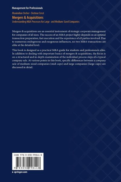 This book is designed as a practical M&A guide for students and professionals alike. In addition to dealing with important basics of mergers & acquisitions, the focus is on a structured and in-depth examination of the individual process steps of a typical company sale. At various points in this book, specific differences between a company sale of medium-sized companies (mid-caps) and large companies (large-caps) are discussed in detail.