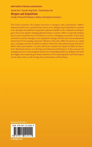 Part 1: Background.- Chapter 1: Introduction to the Study.- Chapter 2: Review of Literature.- Chapter 3: Objectives, Hypotheses and Research Methodology.- Part 2: Analysis of Short-Term Abnormal Returns.- Chapter 4: Event Study Methodology.- Chapter 5: Short-Term Abnormal Returns of Mergers and Acquisitions.- Part 4: Motives of M&A and Analysis of Long-Term Financial Performance.- Chapter 6: Survey of Management View on Motives for Mergers and Acquisitions.- Chapter 7: Financial Performance Analysis of Mergers and Acquisitions.- Part 5: Impact of Corporate Governance Practices.- Chapter 8: Development of Corporate Governance Index.- Chapter 9: Impact of Corporate Governance Score on Abnormal Returns and Financial Performance.- Part 5: Summary and Conclusions.
