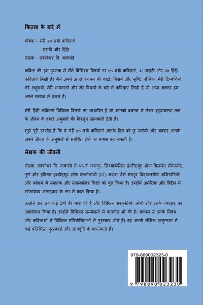 Title - Meri 75 Nayi Kavitayen Marathi Aur Hindi Author - Laxmidhar V. Gaopande This book contains all original and interesting 75 new poems, 38 Marathi and 37 Hindi poems of author. These poems cover various topics like childhood memories, school days, about teachers, good human values, nature, birds, festivals, bravery of soldiers, farmer etc. and observations and opinions about various issues we all see in our society today. You will find these 75 new Marathi and Hindi poems very interesting on various topics which give you wide coverage of our experiences in life covering childhood till old age. Author sincerely feels these poems will touch your heart and often may try to relate to your own life experiences.