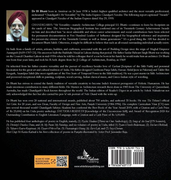 Meri Chup Hi Kavita Kaihndi Hai is the first anthology of Punjabi poetry by Dr SS Bhatti who is an architect by profession. He is the highest qualified architect in India and the most versatile professional in the country. He has the historic honour of being a founder-teacher of Chandigarh College of Architecture from where he retired as the principal. He pursues 55 disciplines out of which Poetry figures among his hot favourites. He has been writing poems in four languages since 1969, and published 5 books in English and 8 anthologies in Urdu, with a critique of Urdu poetry in English, and won prestigious prizes. Dr Bhatti is an impassioned protagonist of literary creativity, especially poetry which he, in agreement with the great Indian tradition, places at Number One on the list of 64 Fine Arts. His credo is that without poetry the bewildering range of human activities on Planet Earth constitute a prosaic plateau that inspires no soul. With his characteristic moral force, he asserts that it is no wonder everything was written in verse form in ancient India.