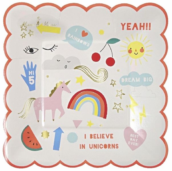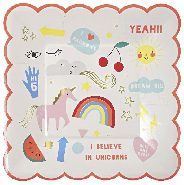 Gefeiert wird im Regenbogenland mit Einhörnern, Feen und Trollen. Für die farbenfrohe Dekoration sorgen 12 Pappteller. Maße: 23 x 23 cm.
