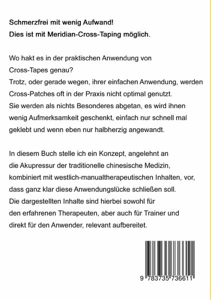 AUF DAUER SCHMERZFREI MIT WENIG AUFWAND!Dies ist mit Meridian-Cross-Taping möglich!Suchst Du nach einer einfachen, aber effektiven Lösung und mit wenig Aufwand für deine Spannungen und Probleme des Bewegungsapparates? Dann ist es gut möglich, dass deine Suche mit diesem Ratgeber am Ende angelangt ist!In therapeutischen Kreisen ist es meistens schon bekannt: Cross-Patches sind kleine Pflaster in Gitterform, die sowohl auf direkte Spannungspunkte der Muskulatur, aber auch auf Reflexpunkte und neurologische Punkte geklebt werden können und damit oft nachhaltig und mit minimalem Aufwand, Themen des Bewegungsapparates bereinigen können.Wo hakt es nun in der praktischen Anwendung von Cross-Patches genau? Trotz, oder gerade wegen, ihrer einfachen Anwendung, werden Cross-Patches oft in der Praxis nicht optimal genutzt. Sie werden als nichts Besonderes abgetan, es wird ihnen wenig Aufmerksamkeit geschenkt, einfach nur schnell mal geklebt und wenn eben nur halbherzig angewandt.In diesem Buch stelle ich ein Konzept, angelehnt an die Akupressur der traditionelle chinesische Medizin, kombiniert mit westlich manual-therapeutischen Inhalten, vor, dass ganz klar diese Anwendungslücke schließen soll. Die dargestellten Inhalte sind hierbei sowohl für den erfahrenen Therapeuten, aber auch für Trainer und direkt für den Anwender, relevant aufbereitet.Gleich ob Du Arzt, Therapeut, Heilpraktiker, Trainer, Coach oder einfacher Anwender bist: Hole Dir dein Buch noch heute und profitiere von seinen Inhalten. Werde für Dich selbst schmerzfrei, oder hilf anderen Menschen mit den Inhalten dieses Ratgebers, schmerzfrei zu werden.