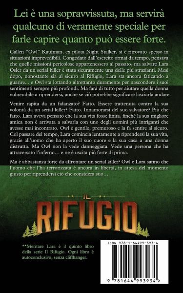 Lei è una sopravvissuta, ma servirà qualcuno di veramente speciale per farle capire quanto può essere forte. Callen "Owl" Kaufman, ex pilota Night Stalker, si è ritrovato spesso in situazioni imprevedibili. Congedato dall'esercito ormai da tempo, pensava che quelle missioni pericolose appartenessero al passato, ma salvare Lara Osler da un serial killer è stata sicuramente una delle più strazianti. Mesi dopo, nonostante sia al sicuro al Rifugio, Lara sta ancora faticando a guarire... e Owl sta lottando altrettanto duramente per nascondere i suoi sentimenti sempre più profondi. Ma farà di tutto per aiutare quella donna vulnerabile a riprendersi, anche se ciò potrebbe significare lasciarla andare. Venire rapita da un fidanzato? Fatto. Essere trattenuta contro la sua volontà da un serial killer? Fatto. Innamorarsi del suo salvatore? Più che fatto. Lara aveva pensato che la sua vita fosse finita, finché la sua migliore amica non è arrivata a salvarla con uno degli uomini più intriganti che avesse mai incontrato. Owl è gentile, premuroso e la fa sentire al sicuro. Col passare del tempo, Lara comincia lentamente a riprendersi la sua vita, grazie all'uomo che ha aperto il suo cuore e la sua casa a una donna distrutta. Ma Owl non la vede danneggiata. Vede una persona che ha attraversato l'inferno... e ne è uscita più forte di prima. Ma è abbastanza forte da affrontare un serial killer? Owl e Lara sanno che l'uomo che l'ha terrorizzata è ancora in libertà, in attesa del momento giusto per riprendersi ciò che considera suo... **Meritare Lara è il quinto libro della serie Il Rifugio. Ogni libro è autoconclusivo, senza cliffhanger.