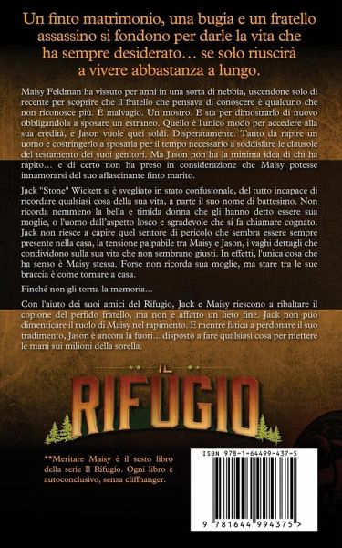 Un finto matrimonio, una bugia e un fratello assassino si fondono per darle la vita che ha sempre desiderato... se solo riuscirà a vivere abbastanza a lungo. Maisy Feldman ha vissuto per anni in una sorta di nebbia, uscendone solo di recente per scoprire che il fratello che pensava di conoscere è qualcuno che non riconosce più. È malvagio. Un mostro. E sta per dimostrarlo di nuovo obbligandola a sposare un estraneo. Quello è l'unico modo per accedere alla sua eredità, e Jason vuole quei soldi. Disperatamente. Tanto da rapire un uomo e costringerlo a sposarla per il tempo necessario a soddisfare le clausole del testamento dei suoi genitori. Ma Jason non ha la minima idea di chi ha rapito... e di certo non ha preso in considerazione che Maisy potesse innamorarsi del suo affascinante finto marito. Jack "Stone" Wickett si è svegliato in stato confusionale, del tutto incapace di ricordare qualsiasi cosa della sua vita, a parte il suo nome di battesimo. Non ricorda nemmeno la bella e timida donna che gli hanno detto essere sua moglie, o l'uomo dall'aspetto losco e sgradevole che si fa chiamare cognato. Jack non riesce a capire quel sentore di pericolo che sembra essere sempre presente nella casa, la tensione palpabile tra Maisy e Jason, i vaghi dettagli che condividono sulla sua vita che non sembrano giusti. In effetti, l'unica cosa che ha senso è Maisy stessa. Forse non ricorda sua moglie, ma stare tra le sue braccia è come tornare a casa. Finché non gli torna la memoria... Con l'aiuto dei suoi amici del Rifugio, Jack e Maisy riescono a ribaltare il copione del perfido fratello, ma non è affatto un lieto fine. Jack non può dimenticare il ruolo di Maisy nel rapimento. E mentre fatica a perdonare il suo tradimento, Jason è ancora là fuori... disposto a fare qualsiasi cosa per mettere le mani sui milioni della sorella. **Meritare Maisy è il sesto libro della serie Il Rifugio. Ogni libro è autoconclusivo, senza cliffhanger.