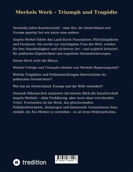 Dieses Buch zeichnet ein umfassendes, differenziertes Bild der Kanzlerschaft Angela Merkels. Es beleuchtet gleichermaßen ihre größten Triumphe - Stabilität, internationale Anerkennung, Krisenbewältigung - wie auch die Schattenseiten ihrer Politik: Reformstau, gesellschaftliche Spaltungen und ungelöste Zukunftsfragen. In sieben Kapiteln wird die Ära Merkel verständlich erklärt und kritisch eingeordnet: von ihren Anfängen in Templin über den Aufstieg zur "mächtigsten Frau der Welt" bis zu den Entscheidungen, die Deutschland bis heute prägen - Energiewende, Migrationskrise, Euro-Rettung, Pandemie. Das Buch zeigt, warum Merkels Erbe ein doppeltes ist - Triumph und Tragödie zugleich - und welche Lehren Deutschland und Europa daraus für die Zukunft ziehen müssen.