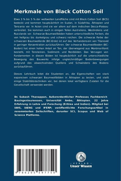 Etwa 3 % bis 5 % der weltweiten Landfläche sind mit Black Cotton Soil (BCS) bedeckt und kommen hauptsächlich im Sudan, in Südafrika, Äthiopien und Tansania vor. In Asien sind sie vor allem auf dem indischen Decca-Plateau verbreitet. Sie kommen auch in einigen Teilen Australiens, Westindiens und Russlands vor. Schwarze Baumwollböden haben unterschiedliche Farben, die von hellgrau bis dunkelgrau und schwarz reichen. Die schwarze Farbe der schwarzen Baumwollerde (BC-Erde) ist auf das Vorhandensein von Titanoxid in geringer Konzentration zurückzuführen. Der schwarze Baumwollboden (BC-Boden) hat einen hohen Anteil an Ton, der überwiegend aus Montmorillonit besteht, mit Tonsteinen, Sediment- und Restböden. Das Versagen von Fundamenten in diesen Böden ist hauptsächlich auf die unterschiedliche Bewegung des Bauwerks infolge ungleichmäßiger Bodenbewegungen aufgrund des abwechselnden Quellens und Schwindens des Bodens zurückzuführen.Dieses Lehrbuch leitet die Studenten an, die Eigenschaften von stark expansiven schwarzen Baumwollböden in Äthiopien zu testen, und stellt einige Stabilitätstechniken vor, bei denen lokal verfügbare Zutaten für die Gesellschaft verwendet werden.
