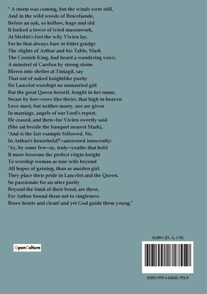 " A storm was coming, but the winds were still, And in the wild woods of Broceliande, Before an oak, so hollow, huge and old It looked a tower of ivied masonwork, At Merlin's feet the wily Vivien lay. For he that always bare in bitter grudge The slights of Arthur and his Table, Mark The Cornish King, had heard a wandering voice, A minstrel of Caerlon by strong storm Blown into shelter at Tintagil, say That out of naked knightlike purity Sir Lancelot worshipt no unmarried girl But the great Queen herself, fought in her name, Sware by her--vows like theirs, that high in heaven Love most, but neither marry, nor are given In marriage, angels of our Lord's report. He ceased, and then--for Vivien sweetly said (She sat beside the banquet nearest Mark), 'And is the fair example followed, Sir, In Arthur's household?'--answered innocently: 'Ay, by some few--ay, truly--youths that hold It more beseems the perfect virgin knight To worship woman as true wife beyond All hopes of gaining, than as maiden girl. They place their pride in Lancelot and the Queen. So passionate for an utter purity Beyond the limit of their bond, are these, For Arthur bound them not to singleness. Brave hearts and clean! and yet God guide them young."