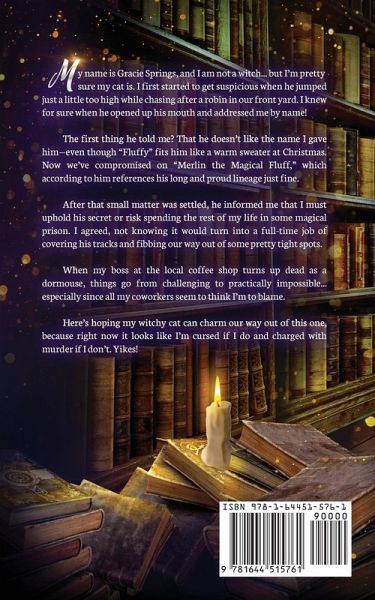 My name is Gracie Springs, and I am not a witch... but I'm pretty sure my cat is. I first started to get suspicious when he jumped just a little too high while chasing after a robin in our front yard. I knew for sure when he opened up his mouth and addressed me by name! The first thing he told me? That he doesn't like the name I gave him-even though "Fluffy" fits him like a warm sweater at Christmas. Now we've compromised on "Merlin the Magical Fluff," which according to him references his long and proud lineage just fine. After that small matter was settled, he informed me that I must uphold his secret or risk spending the rest of my life in some magical prison. I agreed, not knowing it would turn into a full-time job of covering his tracks and fibbing our way out of some pretty tight spots. When my boss at the local coffee shop turns up dead as a dormouse, things go from challenging to practically impossible... especially since all my coworkers seem to think I'm to blame. Here's hoping my witchy cat can charm our way out of this one, because right now it looks like I'm cursed if I do and charged with murder if I don't. Yikes!