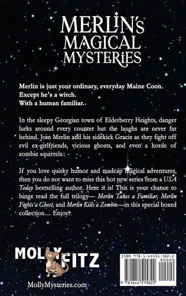 Merlin is just your ordinary, everyday Maine Coon. Except he's a witch. With a human familiar. In the sleepy Georgian town of Elderberry Heights, danger lurks around every counter but the laughs are never far behind. Join Merlin and his sidekick Gracie as they fight off evil ex-girlfriends, vicious ghosts, and even a horde of zombie squirrels. If you love quirky humor and madcap magical adventures, then you do not want to miss this hot new series from a USA Today bestselling author. Here it is! This is your chance to binge read the full trilogy- Merlin Takes a Familiar, Merlin Fights a Ghost, and Merlin Kills a Zombie-in this special boxed collection... Enjoy!