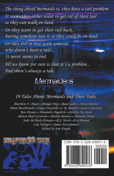 Mermaidens The thing about mermaids is, they have a tail problem. It seems they either want to get rid of their tail so they can walk on land, Or they want to get their tail back, having somehow lost it so they could be on land. Or they fell in love with someone who doesn't have a tail... It never seems to end. All we know for sure is that it's a problem... And that there's always a tale. 19 Tales About Mermaids and Their Tails. Featuring stories by: Matthew F. Amati-Bridget Day-Read Gallo-Nick Clements-Brian MacDonald -Craig Crawford-S. R. Brandt -Jessica Guernsey-Ken Poyner-Alexandra Angeloch-Carolyn Ivy Stein-Barton Paul Levenson-Melody Bowles-Adrienne Wood-Julie McNeely-Kirwan-R.S. Nevil-Eve Morton-Lisa Trefsger-James Fitzsimmons-Edited by Sam Knight