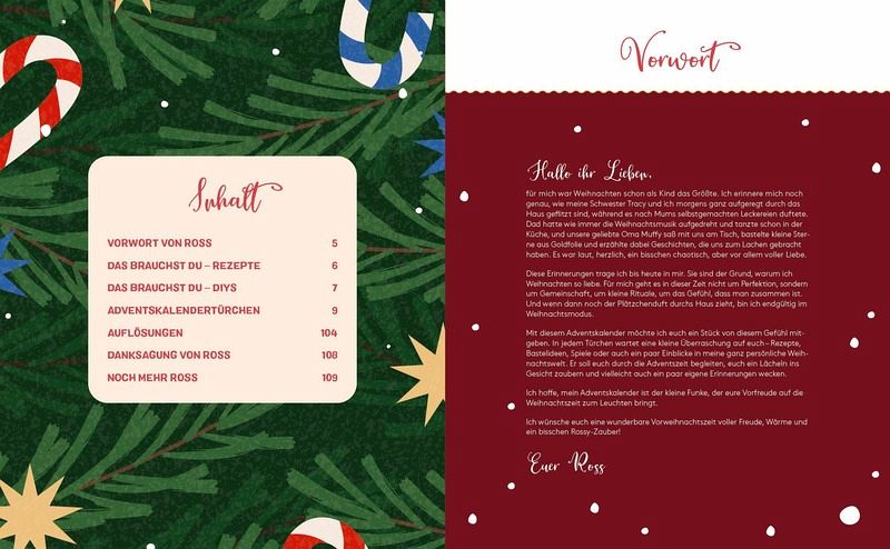 Britische Christmas Crackers, Peanut Butter Fudge und wunderschöne Weihnachtsdeko: Einfach die perforierten Buchseiten auftrennen und jeden Tag eine neue Weihnachtsüberraschung entdecken. Neben DIYs, Rezepten und Spielen gibt es auch Spannendes über Ross zu erfahren: Wie feiert der Publikumsliebling wohl Weihnachten? Findet es im "Wahr oder Falsch"-Rätsel heraus!