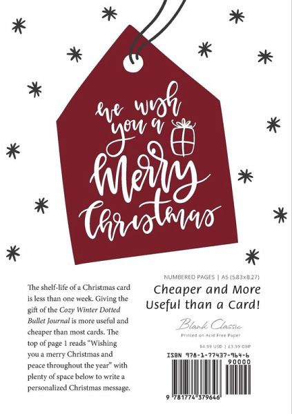 The shelf-life of a Christmas card is less than one week. Giving the gift of the Cozy Winter Dotted Bullet Journal is more useful and cheaper than most cards. The top of page 1 reads "Wishing you a merry Christmas and peace throughout the year" with plenty of space below to write a personalized Christmas message. Blank Classics' Medium format 5.83X8.27 inch dotted bullet journal includes a blank table of contents and numbered pages. Dots are subtly arranged as a guide for writing, illustrations, and charts. Blank Classics' acid free paper, ensures that the creativity within will stand the test of time.