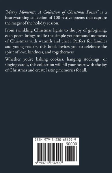 "Merry Moments: A Collection of Christmas Poems" is a heartwarming collection of 100 festive poems that capture the magic of the holiday season. From twinkling Christmas lights to the joy of gift-giving, each poem brings to life the simple yet profound moments of Christmas with warmth and cheer. Perfect for families and young readers, this book invites you to celebrate the spirit of love, kindness, and togetherness. Whether you're baking cookies, hanging stockings, or singing carols, this collection will fill your heart with the joy of Christmas and create lasting memories for all.