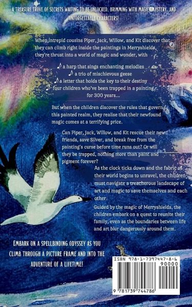 Welcome to Merryshields, undeniably the most magical mansion in the multiverse. It's a treasure trove of secrets waiting to be unlocked, brimming with magic, mystery, and unforgettable characters! When intrepid cousins Piper, Jack, Willow, and Kit discover that they can climb right inside the paintings in Merryshields, they're thrust into a world of magic and wonder, with... ¿ a harp that sings enchanting melodies ¿ a trio of mischievous geese ¿ a letter that holds the key to their destiny ¿ four children who've been trapped in a painting for 300 years... ...but when the children discover the rules that govern this painted realm, they realise that their newfound magic comes at a terrifying price. Can Piper, Jack, Willow, and Kit rescue their new friends, save Silver the dog, and break free from the painting's curse before time runs out? Or will they be trapped, nothing more than paint and pigment forever? As the clock ticks down and the fabric of their world begins to unravel, the children must navigate a treacherous landscape of art and magic to save themselves and each other. Guided by the magic of Merryshields, the siblings embark on a quest to reunite their family, save their friends, and turn a goose into a dog even as the boundaries between life and art blur dangerously around them. Step through the canvas and into a breathtaking journey as you explore the painted world of Merryshields, where magic is real, and the power of love and imagination knows no bounds!