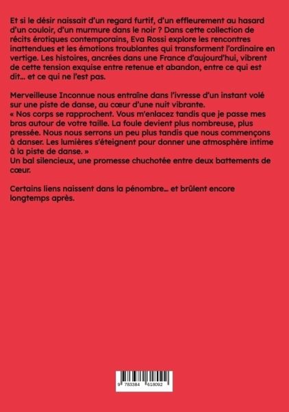 Merveilleuse InconnueHistoires Érotiques Interdites de Sexe Tabou pour AdultesEt si le désir naissait d'un regard furtif, d'un effleurement au hasard d'un couloir, d'un murmure dans le noir ? Dans cette collection de récits érotiques contemporains, Eva Rossi explore les rencontres inattendues et les émotions troublantes qui transforment l'ordinaire en vertige. Les histoires, ancrées dans une France d'aujourd'hui, vibrent de cette tension exquise entre retenue et abandon, entre ce qui est dit... et ce qui ne l'est pas.Merveilleuse Inconnue nous entraîne dans l'ivresse d'un instant volé sur une piste de danse, au coeur d'une nuit vibrante.« Nos corps se rapprochent. Vous m'enlacez tandis que je passe mes bras autour de votre taille. La foule devient plus nombreuse, plus pressée. Nous nous serrons un peu plus tandis que nous commençons à danser. Les lumières s'éteignent pour donner une atmosphère intime à la piste de danse. »Un bal silencieux, une promesse chuchotée entre deux battements de coeur.Certains liens naissent dans la pénombre... et brûlent encore longtemps après.