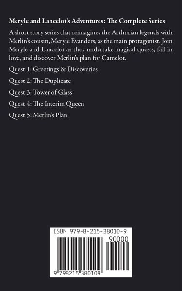 Meryle and Lancelot's Adventures: The Complete Series A short story series that reimagines the Arthurian legends with Merlin's cousin, Meryle Evanders, as the main protagonist. Join Meryle and Lancelot as they undertake magical quests, fall in love, and discover Merlin's plan for Camelot. Quest 1: Greetings & Discoveries Quest 2: The Duplicate Quest 3: Tower of Glass Quest 4: The Interim Queen Quest 5: Merlin's Plan