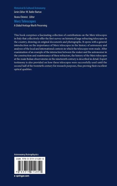 Introduction: the role of Merz telescopes in Italian astronomy - by Ileana Chinnici.- The Merz Company: a Global Player of the 19th Century - by Jurgen Kost & Gudrun Wolfschmidt.- 1850-1900: The Era of Very Large Refractors - by Paolo Brenni.- The maker and the scientist: the relationship between Georg Merz and the Jesuit astronomer Angelo Secchi - by Ileana Chinnici.- Visual double stars measurements with Merz refractors: some statistics - by Giuseppe Massone.- Padua Astronomical Observatory and Merz Workshop: a special connection - by Valeria Zanini.- Merz instruments at Naples Observatory -by Mauro Gargano.- Merz Telescopes at Brera - by Mario Carpino.- Merz telescopes at Rome Astronomical Observatories - by Aldo Altamore & Francesco Poppi.- Merz Telescopes at Catania Royal Astrophysical Observatory - by Andrea Orlando.- Appendix - A list of surviving Merz telescopes outside Italy - by P. Brenni and Ileana Chinnici.