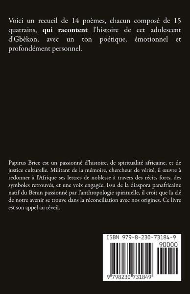 Voici un recueil de 14 poèmes, chacun composé de 15 quatrains, qui racontent l'histoire de cet adolescent d'Gbèkon, avec un ton poétique, émotionnel et profondément personnel.