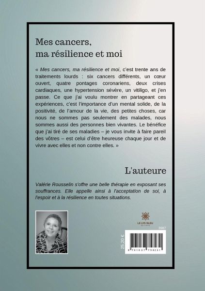 « Mes cancers, ma résilience et moi, c¿est trente ans de traitements lourds : six cancers différents, un c¿ur ouvert, quatre pontages coronariens, deux crises cardiaques, une hypertension sévère, un vitiligo, et j¿en passe. Ce que j¿ai voulu montrer en partageant ces expériences, c¿est l¿importance d¿un mental solide, de la positivité, de l¿amour de la vie, des petites choses, car nous ne sommes pas seulement des malades, nous sommes aussi des personnes bien vivantes. Le bénéfice que j¿ai tiré de ses maladies ¿ je vous invite à faire pareil des vôtres ¿ est celui d¿être heureuse chaque jour et de vivre avec elles et non contre elles. »
