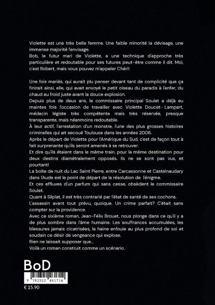Violette est une très belle femme. Une faible minorité la dévisage, une immense majorité l'envisage.Bob, le futur mari de Violette, a une technique d'approche très particulière et redoutable pour ses futures peut-être comme il dit. Moi, c'est Robert, mais vous pouvez m'appeler Chéri!Une fois mariés, qui aurait plu penser devant tant de complicité que ça finirait ainsi, elle, qui avait envoyé le petit oiseau du paradis à l'enfer, du chaud au froid juste avant la douce explosion.Depuis plus de deux ans, le commissaire principal Soulet a déjà eu maintes fois l'occasion de travailler avec Violette Doucet-Lampart, médecin légiste très compétente mais très réservée, presque transparente, mais néanmoins redoutable.À leur actif, l'arrestation d'un monstre, l'une des plus grosses histoires criminelles qui ait secoué Toulouse dans les années 2006.Après le départ de Violette pour l'Amérique du Sud, c'est de façon tout à fait surprenante qu'ils seront amenés à se retrouver.Et dire qu'ils étaient dans le même train. pour la même destination pour deux destins diamétralement opposés. Ils ne se sont pas vus, et pourtant!La boîte de nuit du Lac Saint Pierre, entre Carcassonne et Castelnaudary dans l'Aude est le point de départ de la résolution de l'énigme.Et ces effluves d'un parfum qui sans cesse, obsèdent le commissaire Soulet.Quant à Silplat, il est très contrarié par l'état de santé de ses cochons.L'assassin avant tout prévu, quoique. Un crime parfait? C'était sans compter sur la providence.Avec ce sixième roman, Jean-Félix Brouet, nous plonge dans ce qu'il y a de plus sombre dans l'âme humaine. Les souffrances accumulées, les blessures jamais cicatrisées, la haine enfouie au plus profond de soi et soudain ce désir de vengeance qui explose.Rien ne laissait supposer que... Voilà un roman construit comme un scénario.