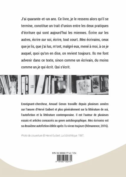 J'ai quarante-et-un ans. Ce livre, je le ressens alors qu'il se termine, constitue un trait d'union entre les deux pratiques d'écriture qui sont aujourd'hui les miennes. Écrire sur les autres, écrire sur soi, écrire, tout court. Mes écrivains, ceux que je lis, que j'ai lus, m'ont, malgré eux, mené à moi, à ce "je" auquel, quoi qu'on en dise, on revient toujours. Ils me font advenir dans ce texte, sinon comme un écrivain, du moins comme un "je" qui écrit. Qui s'écrit.