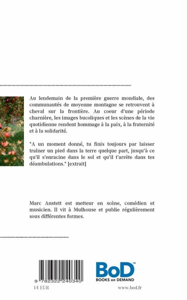 Au lendemain de la première guerre mondiale, des communautés de moyenne montagne se retrouvent à cheval sur la frontière. Au coeur d'une période charnière, où l'entente entre les gouvernements reste fragile, les images bucoliques, les scènes de la vie quotidienne et les idéaux de ces paysans vivant hors système, rendent hommage à la paix, à la fraternité et à la solidarité. Alors que d'autres ont fui la guerre ou sont morts au combat, cette poignée d'irréductibles s'accroche à son territoire pour tenter de bâtir un monde meilleur, à la limite de l'autarcie et de la légalité... "À un moment donné, tu finis toujours par laisser traîner ton pied dans la terre quelque part, jusqu'à ce qu'il s'enracine dans le sol et qu'il t'arrête dans tes déambulations" [extrait]"Je n'ai aucune légitimité pour parler de vérité historique. Si cette petite histoire s'inscrit dans la grande, c'est parce qu'elle s'inspire de faits réels identifiables. Néanmoins, j'ai privilégié la vie de personnages imaginaires, dans un univers où la poésie se mêle au réalisme. Cela donne au récit les traits d'une chronique rurale."Marc Anstett est metteur en scène, comédien, musicien. Il vit en France, dans la Région Grand Est, et publie régulièrement sous différentes formes.