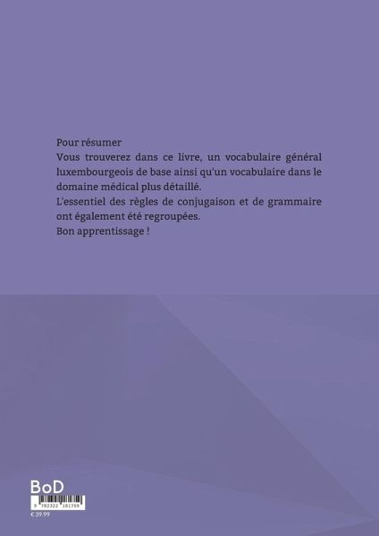 Pour résumer,vous trouverez dans ce livre, un vocabulaire général luxembourgeois ainsi qu'un vocabulaire dans le domaine médical plus détaillé.L'essentiel des règles de conjugaison et de grammaire ont également été regroupées.Bon apprentissage !