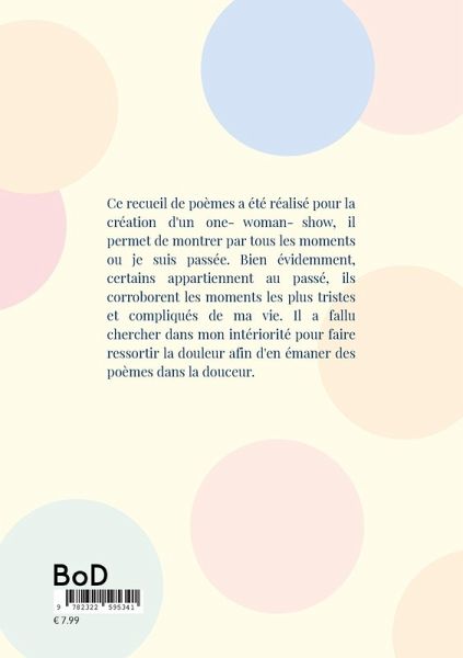 Ce recueil de poèmes a été réalisé pour la création d'un one-woman-show, il permet de montrer par tous les moments ou je suis passée. Bien évidemment, certains appartiennent au passé, ils corroborent les moments les plus tristes et compliqués de ma vie. Il a fallu chercher dans mon intériorité pour faire ressortir la douleur afin d'en émaner des poèmes dans la douceur.