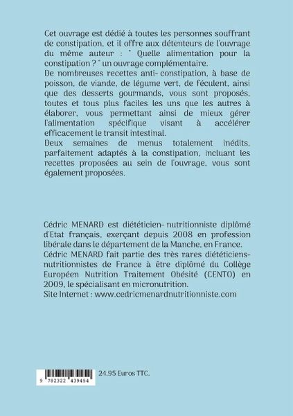 Cet ouvrage est dédié à toutes les personnes souffrant de constipation, et il offre aux détenteurs de l'ouvrage du même auteur : " Quelle alimentation pour la constipation ? " un ouvrage complémentaire.De nombreuses recettes anti-constipation, à base de poisson, de viande, de légume vert, de féculent, ainsi que des desserts gourmands, vous sont proposés, toutes et tous plus faciles les uns que les autres à élaborer, vous permettant ainsi de mieux gérer l'alimentation spécifique visant à accélérer efficacement le transit intestinal.Deux semaines de menus totalement inédits, parfaitement adaptés à la constipation, incluant les recettes proposées au sein de l'ouvrage, vous sont également proposées.
