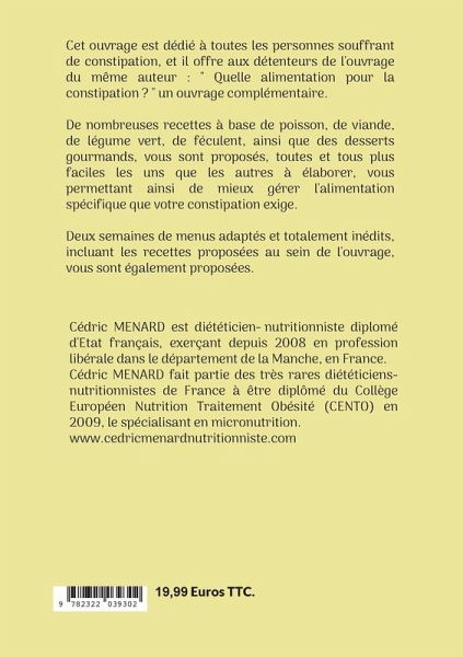 Cet ouvrage est dédié à toutes les personnes souffrant de constipation, et il offre aux détenteurs de l'ouvrage du même auteur : " Quelle alimentation pour la constipation ? " un ouvrage complémentaire.De nombreuses recettes à base de poisson, de viande, de légume vert, de féculent, ainsi que des desserts gourmands, vous sont proposés, toutes et tous plus faciles les uns que les autres à élaborer, vous permettant ainsi de mieux gérer l'alimentation spécifique que votre constipation exige.Deux semaines de menus adaptés et totalement inédits, incluant les recettes proposées au sein de l'ouvrage, vous sont également proposées.