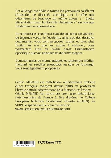 Cet ouvrage est dédié à toutes les personnes souffrant d'épisodes de diarrhée chronique, et il offre aux détenteurs de l'ouvrage du même auteur : " Quelle alimentation pour la diarrhée chronique ? " un ouvrage totalement complémentaire.De nombreuses recettes à base de poisson, de viande, de légume vert, de féculent, ainsi que des desserts gourmands, vous sont proposés, toutes et tous plus faciles les uns que les autres à élaborer, vous permettant ainsi de mieux gérer l'alimentation spécifique que vos épisodes de diarrhée exigent.Deux semaines de menus adaptés et totalement inédits, incluant les recettes proposées au sein de l'ouvrage, vous sont également proposées.
