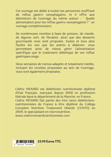 Cet ouvrage est dédié à toutes les personnes souffrant de reflux gastro-oesophagiens, et il offre aux détenteurs de l'ouvrage du même auteur : " Quelle alimentation pour les reflux gastro-oesophagiens ? " un ouvrage complémentaire.De nombreuses recettes à base de poisson, de viande, de légume vert, de féculent, ainsi que des desserts gourmands vous sont proposés, toutes et tous plus faciles les uns que les autres à élaborer, vous permettant ainsi de mieux gérer l'alimentation spécifique que le traitement diététique de vos reflux gastriques exige.Deux semaines de menus adaptés et totalement inédits, incluant les recettes proposées au sein de l'ouvrage, vous sont également proposées.
