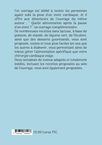 Cet ouvrage est dédié à toutes les personnes ayant subi la pose d'un stent cardiaque, et il offre aux détenteurs de l'ouvrage du même auteur : " Quelle alimentation après la pause d'un stent ? " un ouvrage complémentaire.De nombreuses recettes sans lactose, à base de poisson, de viande, de légume vert, de féculent, ainsi que des desserts gourmands, vous sont proposés, toutes et tous plus faciles les uns que les autres à élaborer, vous permettant ainsi de mieux gérer l'alimentation spécifique que votre chirurgie cardiaque exige.Deux semaines de menus adaptés et totalement inédits, incluant les recettes proposées au sein de l'ouvrage, vous sont également proposées.