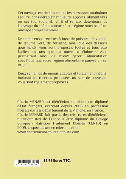 Cet ouvrage est dédié à toutes les personnes souhaitant réduire considérablement leurs apports alimentaires en sel (ou sodium), et il offre aux détenteurs de l'ouvrage du même auteur : " Le régime sans sel. " un ouvrage complémentaire.De nombreuses recettes à base de poisson, de viande, de légume vert, de féculent, ainsi que des desserts gourmands, vous sont proposés, toutes et tous plus faciles les uns que les autres à élaborer, vous permettant ainsi de mieux gérer l'alimentation spécifique que votre régime alimentaire pauvre en sel exige.Deux semaines de menus adaptés et totalement inédits, incluant les recettes proposées au sein de l'ouvrage, vous sont également proposées.