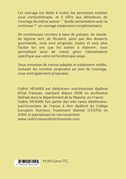 Cet ouvrage est dédié à toutes les personnes traitées sous corticothérapie, et il offre aux détenteurs de l'ouvrage du même auteur : " Quelle alimentation avec la cortisone ? " un ouvrage totalement complémentaire.De nombreuses recettes à base de poisson, de viande, de légume vert, de féculent, ainsi que des desserts gourmands, vous sont proposés, toutes et tous plus faciles les uns que les autres à élaborer, vous permettant ainsi de mieux gérer l'alimentation spécifique que votre corticotherapie exige.Deux semaines de menus adaptés et totalement inédits, incluant les recettes proposées au sein de l'ouvrage, vous sont également proposées.