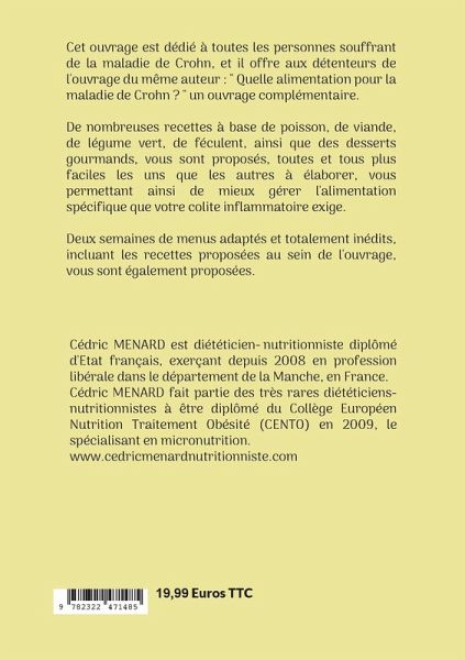 Cet ouvrage est dédié à toutes les personnes souffrant de la maladie de Crohn, et il offre aux détenteurs de l'ouvrage du même auteur : " Quelle alimentation pour la maladie de Crohn ? " un ouvrage complémentaire.De nombreuses recettes à base de poisson, de viande, de légume vert, de féculent, ainsi que des desserts gourmands, vous sont proposés, toutes et tous plus faciles les uns que les autres à élaborer, vous permettant ainsi de mieux gérer l'alimentation spécifique que votre colite inflammatoire exige.Deux semaines de menus adaptés et totalement inédits, incluant les recettes proposées au sein de l'ouvrage, vous sont également proposées.